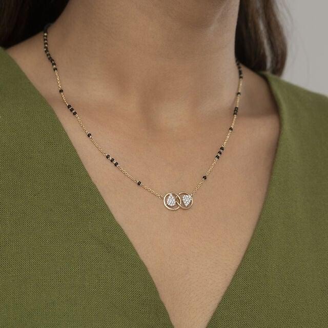 Opt for a short mangalsutra featuring a striking central pendant that celebrates the meeting of two hearts through its visuals. Made from 14 KT gold, the two interlocked circles with pear-shaped micro pave diamonds reiterate the eternally moored nature of your bond.